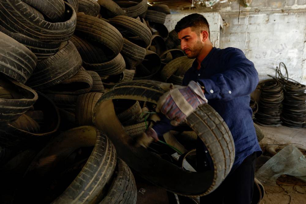 يجمع مدين حلس إطارات السيارات المستعملة، ويعيد تدويرها إلى مواد تستعمل كطبقة أساس للعشب الصناعي بالمنشآت الرياضية، وكذلك لأغراض أخرى في الزراعة بقطاع غزة الفقير.